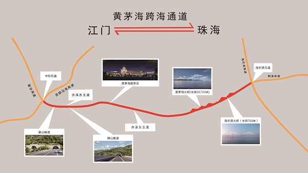 黃茅??绾Mǖ朗歉壑榘拇髽虻奈餮?,起于珠海市平沙鎮(zhèn),向西跨越黃茅海水域,終于臺山市斗山鎮(zhèn);全長約31公里,跨海段長度約14公里,雙向六車道,設置高欄港大橋(主跨700米雙塔單跨)、目前世界上跨徑最大的三塔斜拉公路橋——黃茅海大橋(2*720米三塔雙跨斜拉橋)2座主橋,隧道2座,互通4座,服務區(qū)1處。