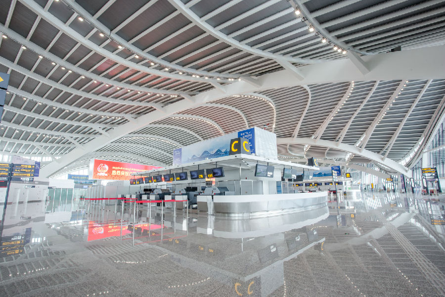 新建成的桂林機場T2航站樓造型設計以桂林山水甲天下為靈感,通過高難度建設屋頂曲面交疊,自然形成側面天窗,打造以山水般起伏流動的屋面線條和天際線構成一頂靚麗的“山水桂冠”,使機場與山水融為一體、相得益彰、交相輝映。樓內設施和功能以“平安、綠色、智慧、人文”機場為理念設計,充分體現了航空運輸快速、高效、人性化的高質量、高品質。T2設有4個值機島和22條安檢通道,能滿足每小時近4000人次進出港的高峰流量,設備設施應用了智能化行李分揀系統、呼叫中心平臺、安保集成平臺、人臉識別等“智慧空港”技術手段,可實現旅客安全、便捷出行。此外,航站樓還分布規劃了涵蓋餐飲、百貨、免稅及休閑娛樂等多種業態的商業區,設計了桂韻廊、藝術空間、音樂閱讀區等三大人文主題場景,力求為旅客提供更多更高品質的出行體驗。