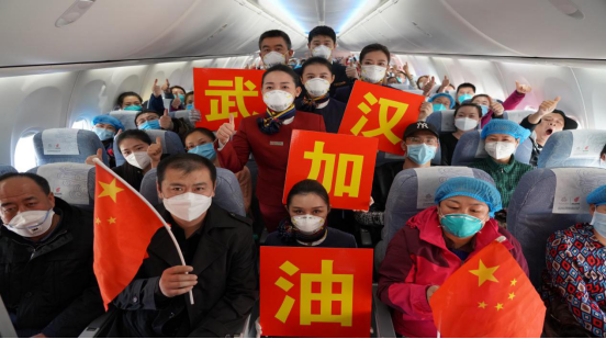 2月15日至16日,國航內蒙古公司2天執飛3架救援包機,30小時內緊急運送內蒙古自治區三批醫療隊243名醫護人員、13.7噸醫療物資馳援湖北武漢。圖為第六批醫療隊與乘務組合影。