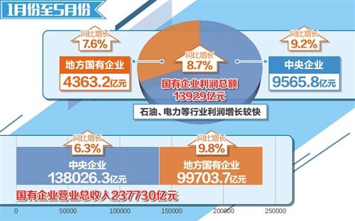 在前5個月國企利潤中,中央企業9565.8億元,同比增長9.2%;地方國有企業4363.2億元,同比增長7.6%。