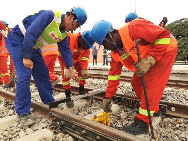 8月2日,在安哥拉洛比托鐵路項目現場,中國中鐵二十局本格拉鐵路項目員工在進行鐵路維護。新華社發(柳志 攝)