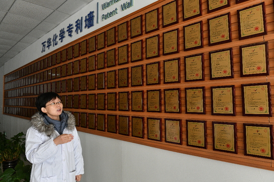 在煙臺萬華化學集團中央研究院先進表面材料中心,萬華員工在專利墻前介紹萬華取得的科技創新成就。(資料照片)