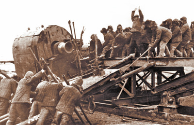 大會戰時期,王進喜(中)和鉆井工人們人拉肩扛運鉆機,保障鉆井作業。(資料圖片)