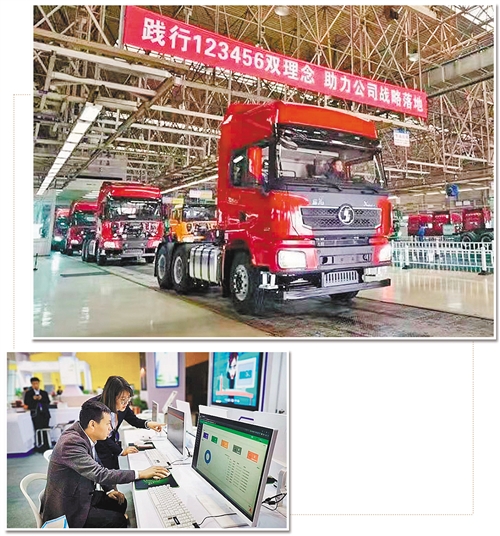 (上圖:陜汽控股汽車總裝廠車間內景。下圖:陜汽控股員工正在測試“天行健”車聯網平臺。記者 張 毅攝)