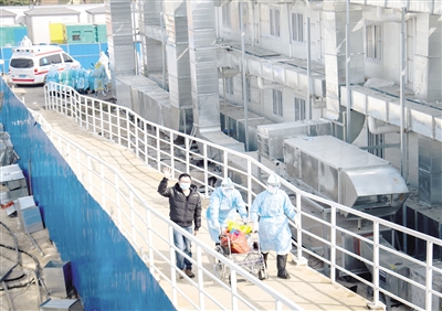 2月4日,醫護人員將患者送入病房。當日,武漢火神山新型冠狀病毒感染肺炎??漆t院開始正式接診新型冠狀病毒感染的肺炎確診患者。(記者 肖藝九 攝)