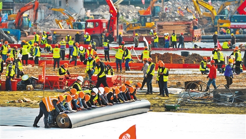 2月4日,武漢火神山新型冠狀病毒感染肺炎專科醫院正式接診。圖為中建三局火神山醫院項目工人正在鋪設HDPE膜。 王騰 攝(中經視覺)
