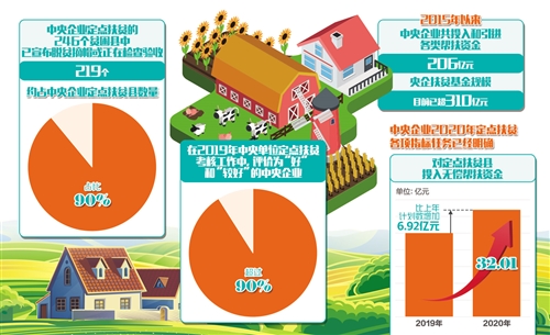 最新數據顯示,截至目前,中央企業定點扶貧的246個貧困縣中,219個已宣布脫貧摘帽或正在檢查驗收,約占中央企業定點扶貧縣數量的90%;在2019年中央單位定點扶貧考核工作中,評價為“好”和“較好”的中央企業超過了90%。