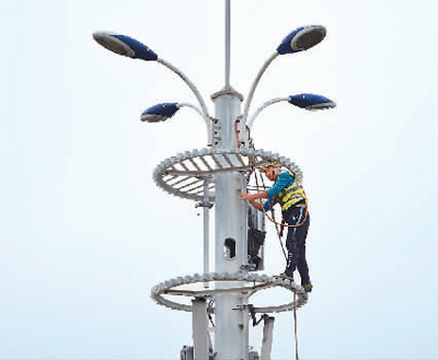 中國鐵塔股份有限公司工作人員在長沙市天心區披塘路5G基站上加掛5G天線。