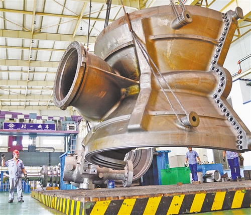 在東北老國企哈電集團哈爾濱汽輪機廠生產車間,工人在進行生產作業(2019年9月3日攝)。