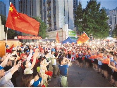 7月26日晚,在河南省鄭州市謙祥萬和城小區,國家電網安徽電力援豫搶修隊合肥分隊經過兩天兩夜奮戰,已恢復對該小區的電力供應。圖為小區居民歡呼表示感謝 劉晶東攝(人民視覺)