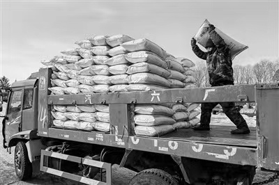 北大荒集團五大連池農場科技服務中心工人在裝運肥料。新華社發