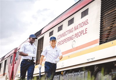 在肯尼亞內羅畢,非洲之星鐵路運營公司機輛部的火車駕駛員(右)與學員從蒙內鐵路機車旁走過。