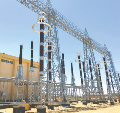 位于蘇伊士省的??怂_迪亞500千伏變電站項目現場,鐵塔高聳,一條條高壓輸電導線接入變電站設備,電流通過導線時發出嗡嗡聲。