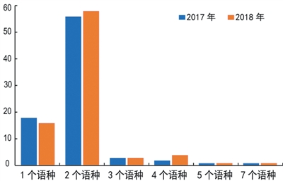 《報告》對中央企業多語種網站進行了統計。截至2018上半年,96家中央企業共86家開通多語種官網,開通率達89.6%。其中以覆蓋英文、中文(繁體)2個語種為主,開通企業數為58個。與2017年同期相比,中央企業開通4個語種官網的增加2家,開通2個語種官網的增加2家。