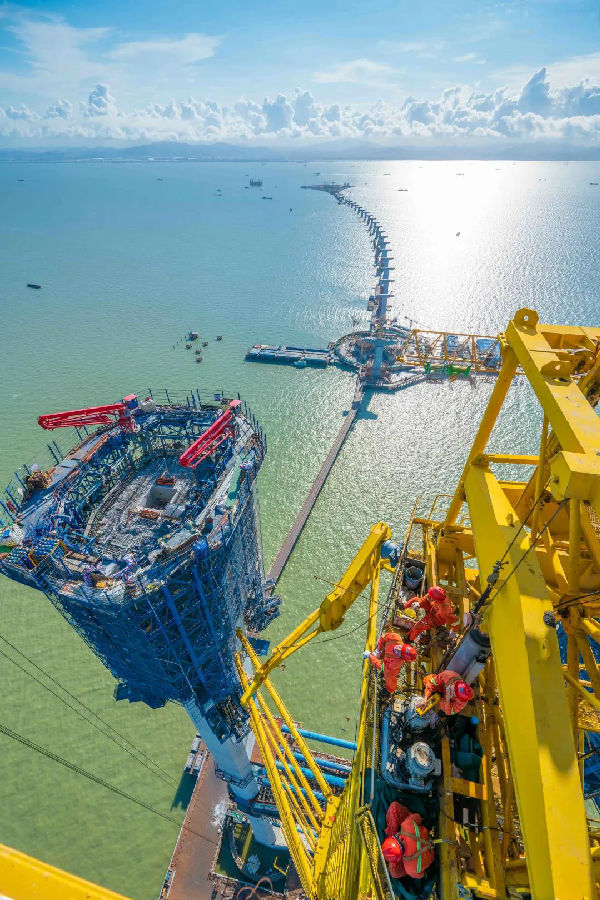 不久前,中交集團所屬中交二航局承建的深中通道關鍵性控制工程伶仃洋大橋迎來重要節點——東索塔成功封頂。遠眺塔柱最頂端,清晰可見矗立著一個高8層、重達400余噸的超級設備,形狀宛如一座“寶塔”,這是國內自主研發的首個智能一體化筑塔機。