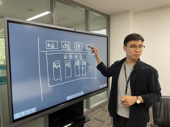 輪崗期間,青馬學員段澤源向同事講解業務中臺與國網電商公司各業務產品線之間的關系