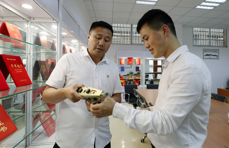 龍福剛在與同事分享交流創新成果技術。(盧關文 攝)