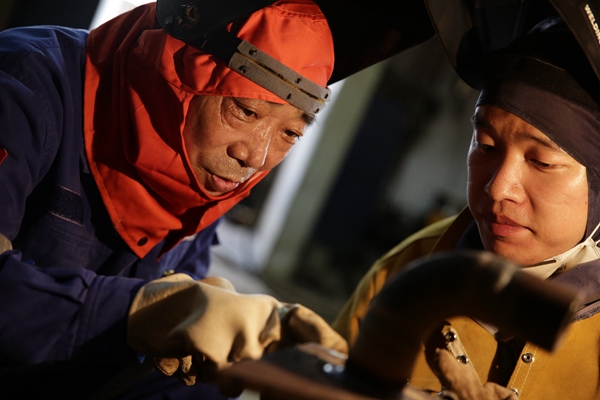 海油工程塘沽焊工培訓室高級教練劉伯勝(左)正在向“嘉克杯”國際焊接技能大賽選手傳授實操技能