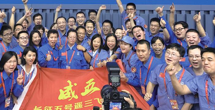 2019年12月27日,工作人員慶祝長五遙三任務發射成功