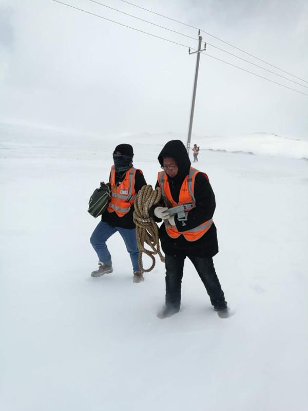 雪還在繼續(xù)下著,風也更急了。凌晨3點多,白塔子工區(qū)搶修隊員到達天河梁,這里的積雪比想象中的要厚很多,車輛根本無法正常通過。王永杰說:“咱們務必在最短時間內查出故障,沒有車,扛也得把設備扛進去!”9級大風夾雜著雪花,吹得隊員們睜不開眼睛。為了在恢復供電上贏得寶貴時間,又寒又饑、疲憊不堪的他們,渴了喝一口帶冰碴的礦泉水,餓了嚼上一口方便面,接著趕赴下一個地點排障。