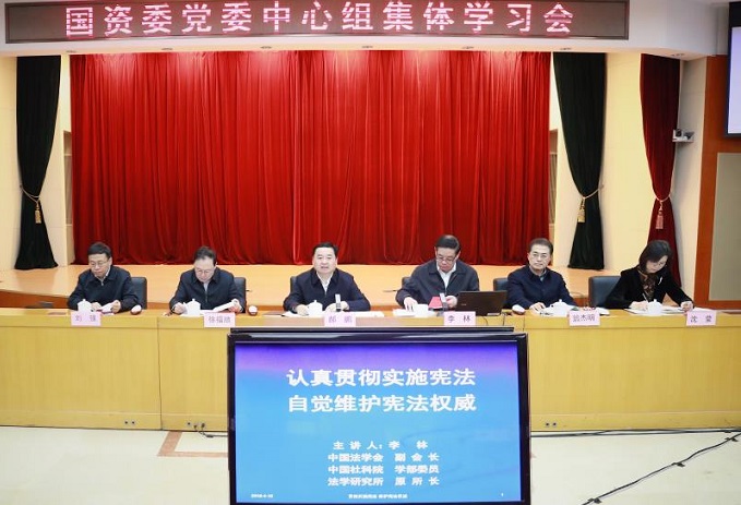 4月10日,國資委黨委召開黨委理論學習中心組集體學習(擴大)會議,深入學習習近平總書記關于憲法和全面依法治國的重要思想,深刻領會十三屆全國人大一次會議通過的憲法修正案核心要義和精神實質。黨委書記郝鵬主持會議并強調,要認真貫徹落實黨中央重大決策部署,進一步弘揚憲法精神、增強憲法意識,推動國資委機關學習宣傳和貫徹實施憲法活動深入開展。中國社會科學院學部委員、中國法學會副會長李林作專題講座,國資委黨委成員參加會議。