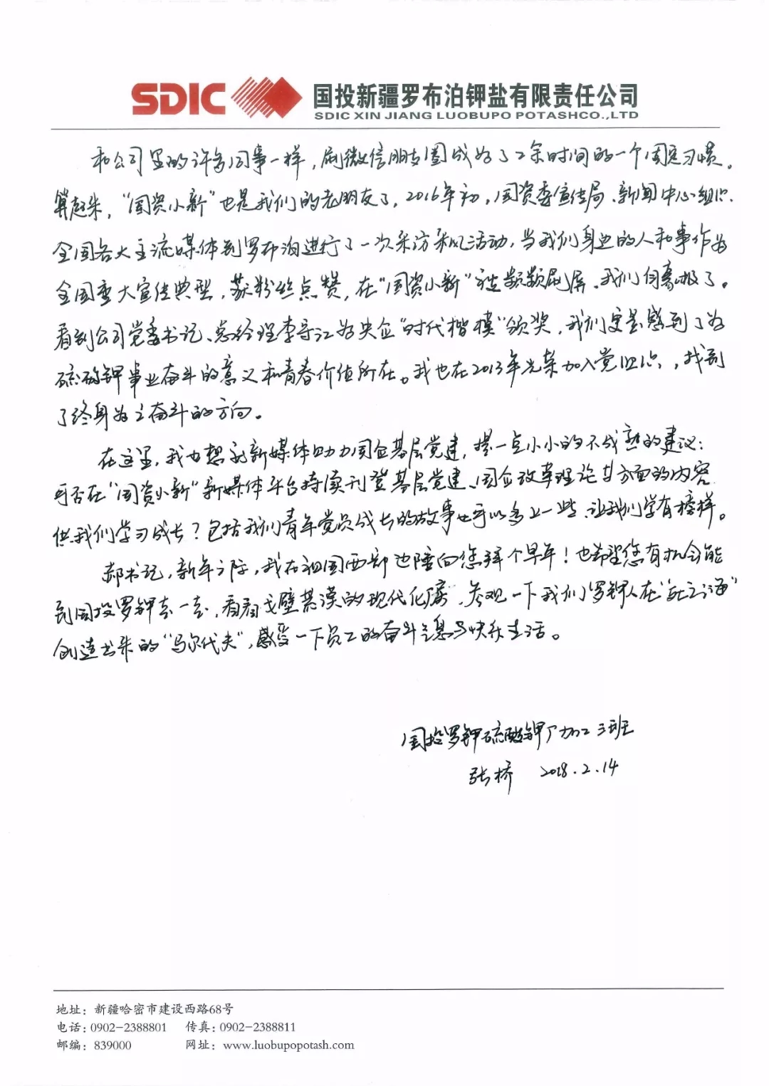 我是國投新疆羅布泊鉀鹽有限責任公司的一名普通的85后員工。前幾天,通過“國資小新”微信看到了您在接受《求是》雜志專訪的《新時代國有企業的戰略定位與歷史使命》文章,受益匪淺。您的思考,通篇貫徹著習近平新時代中國特色社會主義思想,為我們講述了新時代國有企業的戰略定位、歷史使命和改革發展的新目標新舉措,不僅解開了我們基層員工的一些思想困惑,也指明了我們國企未來的發展方向。所以,就想通過寫信的方式和您交流一下學習心得。