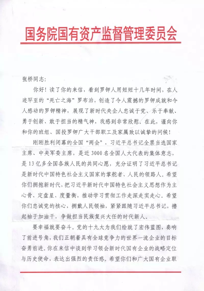 郝鵬書記收到這封千里之外的基層青年的來信后,在百忙之中親自寫了回信。郝鵬書記在回信中對羅鉀人在羅布泊創造的成就、羅鉀人身上展現出來的新時代央企人的精氣神感到非常欣慰,并向廣大一線干部職工表達了衷心的祝賀和美好的祝福。