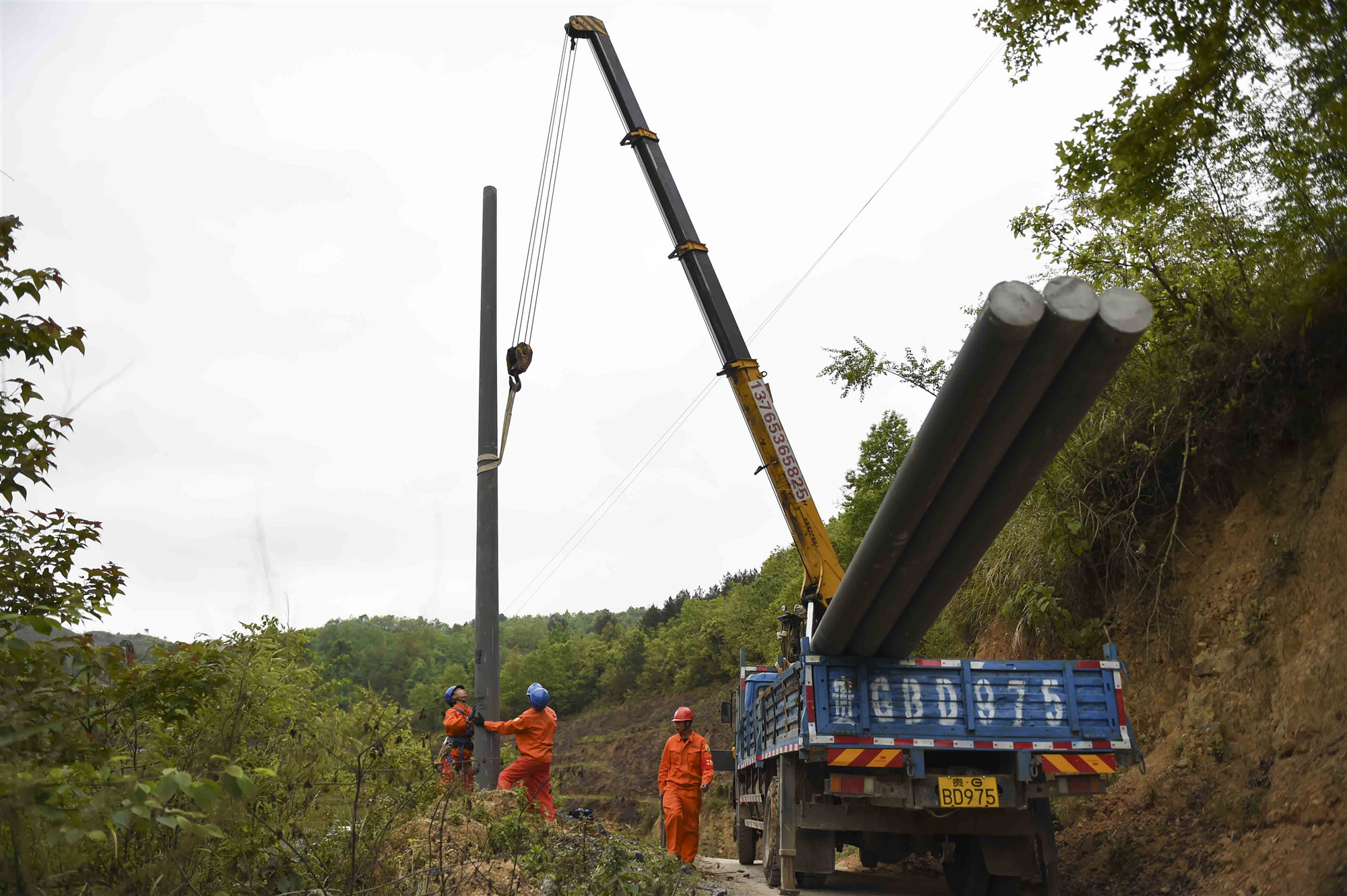 在貴州紫云縣松山街道同心村,電力施工人員全力加速建設,讓村民早日用上安全電、舒心電。陳娟 攝