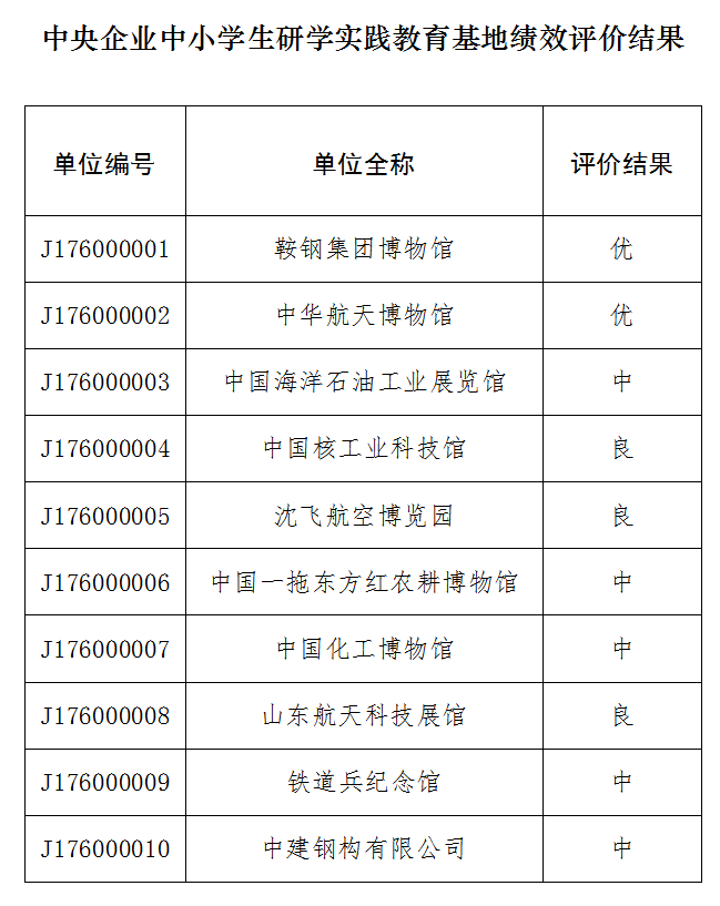 按照《教育部辦公廳關于做好2019年度中央專項彩票公益金支持未成年人校外教育項目支出績效評價工作的通知》(教基廳函〔2020〕12號)要求,我們對鞍鋼集團博物館等10家中央企業中小學生研學實踐教育基地開展了績效評價工作,現將結果予以公示。