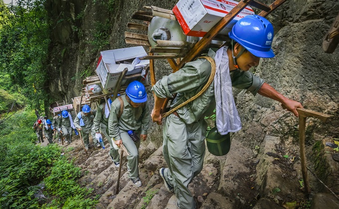 湖北省長陽縣,土家電工用背架運送村村通動力電材料