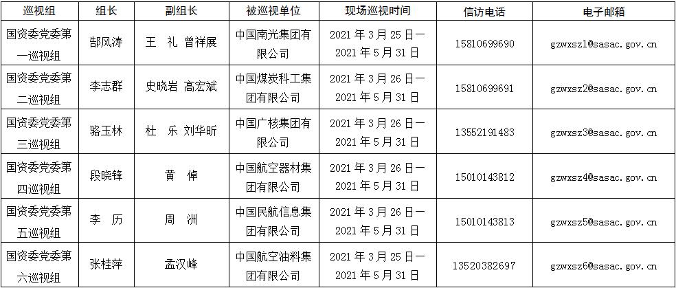 國資委黨委2021年第一輪巡視進駐一覽表