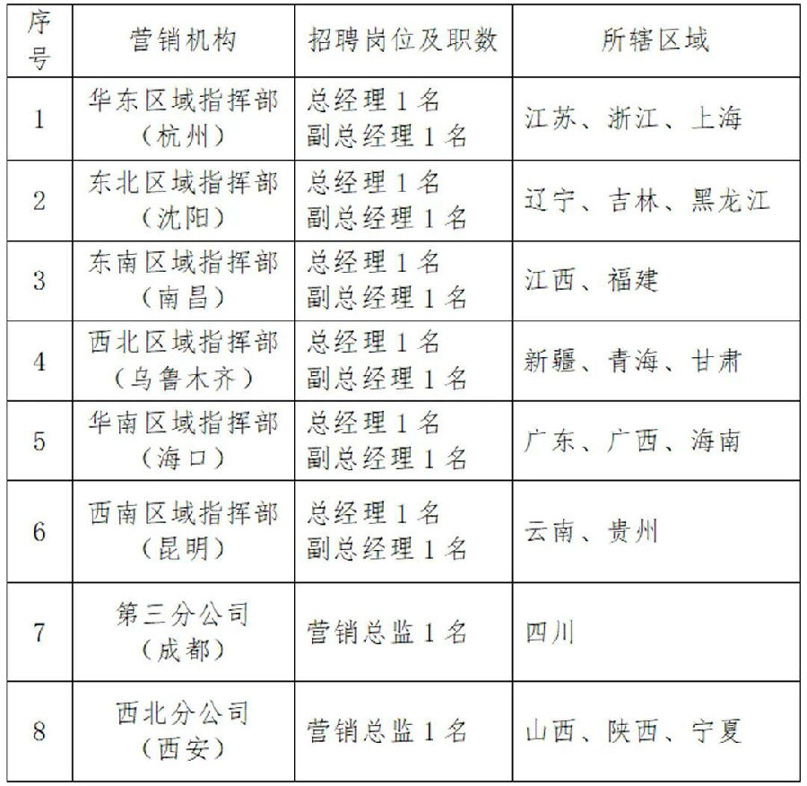 為推進公司“三年五年規劃、十年三十年愿景目標”中長期發展戰略,全面深化改革,創新管理體制,根據工作需要,擬公開招聘市場營銷區域機構負責人,現將有關事項公告如下: