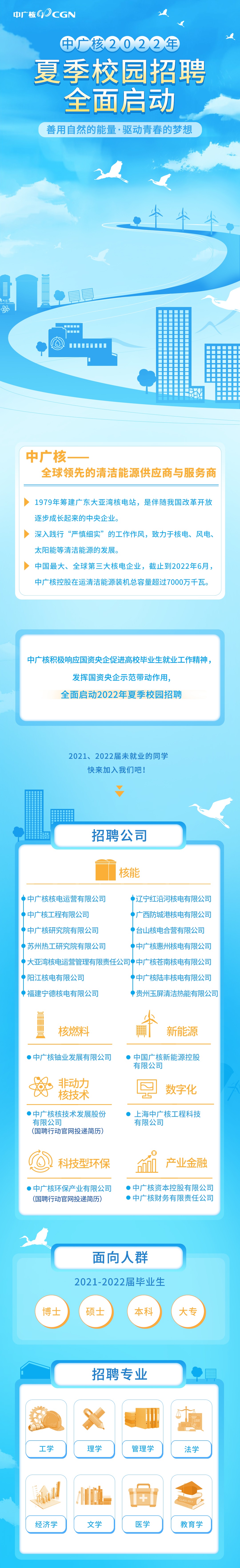 為深入貫徹習近平總書記關于做好高校畢業生就業工作的重要指示批示精神,堅決落實黨中央、國務院穩就業保就業決策部署,充分發揮國資央企促就業示范帶動作用,中廣核作為全球領先的清潔能源供應商與服務商,積極踐行央企擔當,全面啟動2022年夏季校園招聘,誠邀廣大高校畢業生,為助力實現“雙碳”目標貢獻智慧,一起點亮綠色未來!