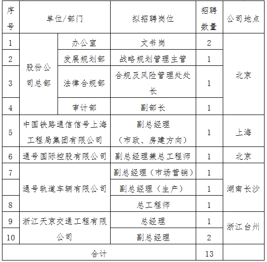 此次招聘是中國通號面向全社會進行的公開招聘,將秉持公開、公平、公正的原則在公司內外廣納賢才,股份公司內部、外部人員均可報名應聘。