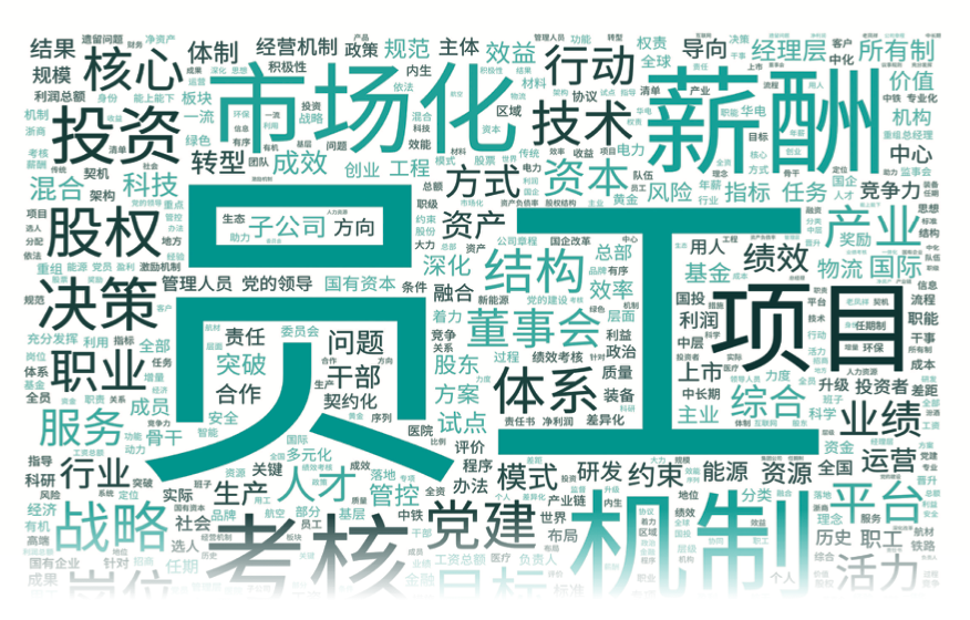 去掉詞頻出現最高的“企業、公司、發展、改革、經營、管理、集團、工作”等相對抽象的詞匯,出現頻次最多的詞是員工(906次)、市場化(883次)、機制(875次)等。