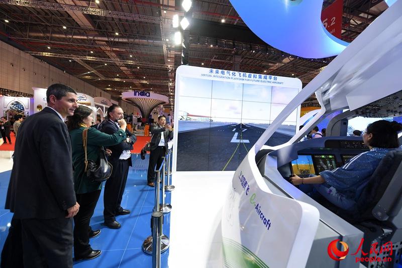 11月6日,外國觀眾正在參觀未來電氣化飛機虛擬集成平臺。(人民網記者 翁奇羽 攝)