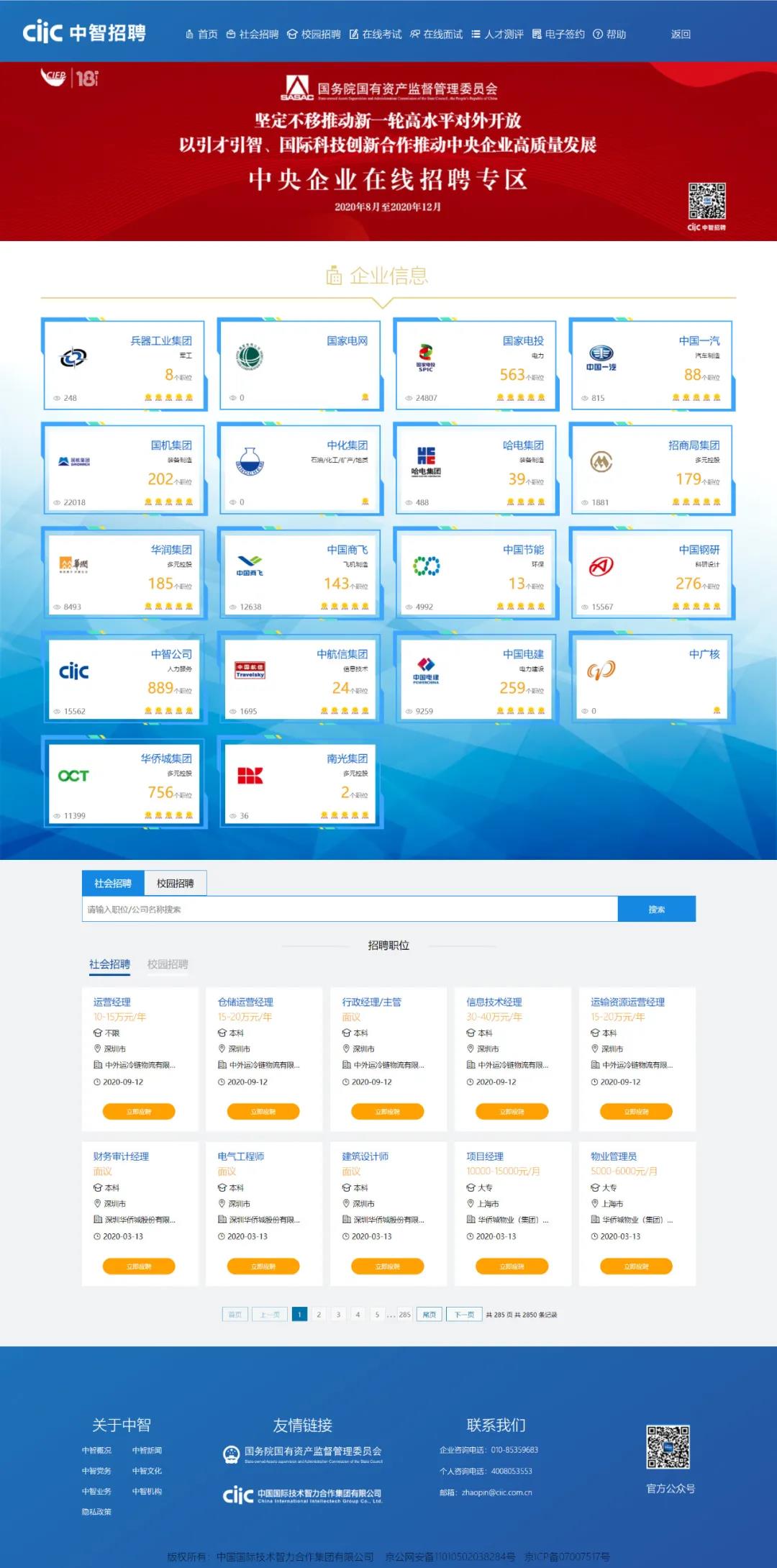 本次大會設立了“中央企業在線招聘專區”,中智集團發揮自身優勢,依托“中智招聘”專業平臺,承辦專區在線招聘活動,為各參展中央企業提供“在線招聘、在線宣講會、在線考試、在線面試、人才測評、電子簽約”等全流程線上招聘服務。
