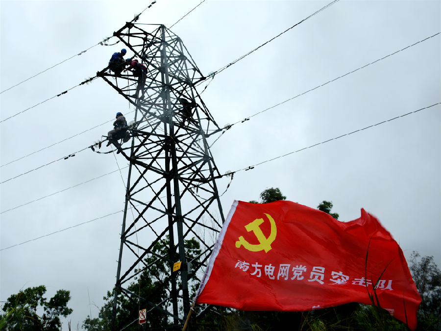 6月14日,臺風“鸚鵡”來襲,南方電網廣東茂名信宜供電局黨員突擊隊現場搶修。(葉茂 攝)