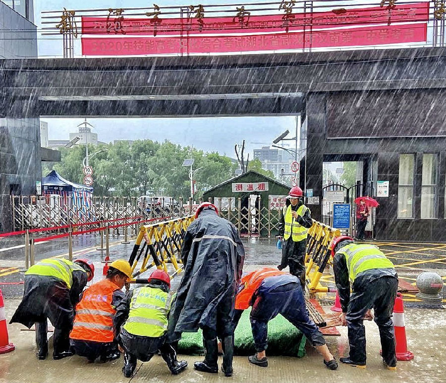 7月7日高考第一天,中交二航局馬影河項(xiàng)目組建防汛應(yīng)急救援搶險(xiǎn)隊(duì)趕往漢南一中校門(mén)口,搭建小型“浮橋”,保障考生通行。
