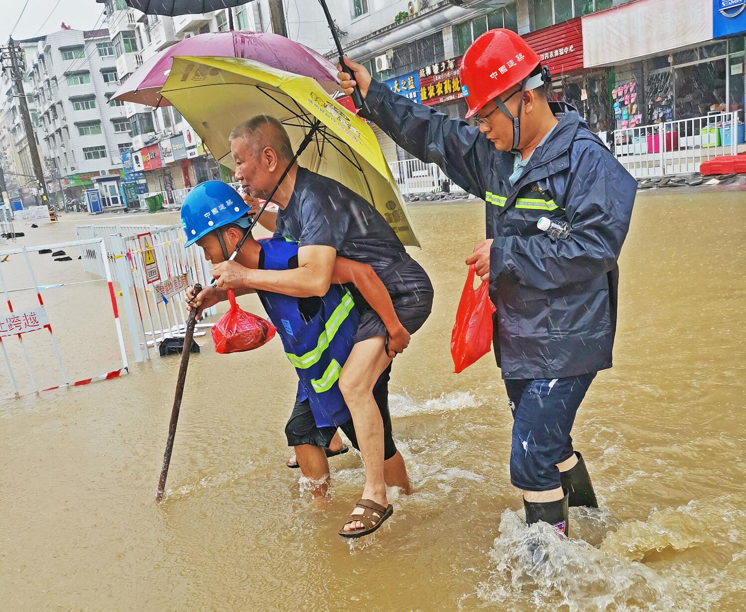 受連日暴雨影響,江西省彭澤縣內澇嚴重。中建二局西南公司志愿者立即出動,站崗疏導交通,幫助轉移水深處受困市民。