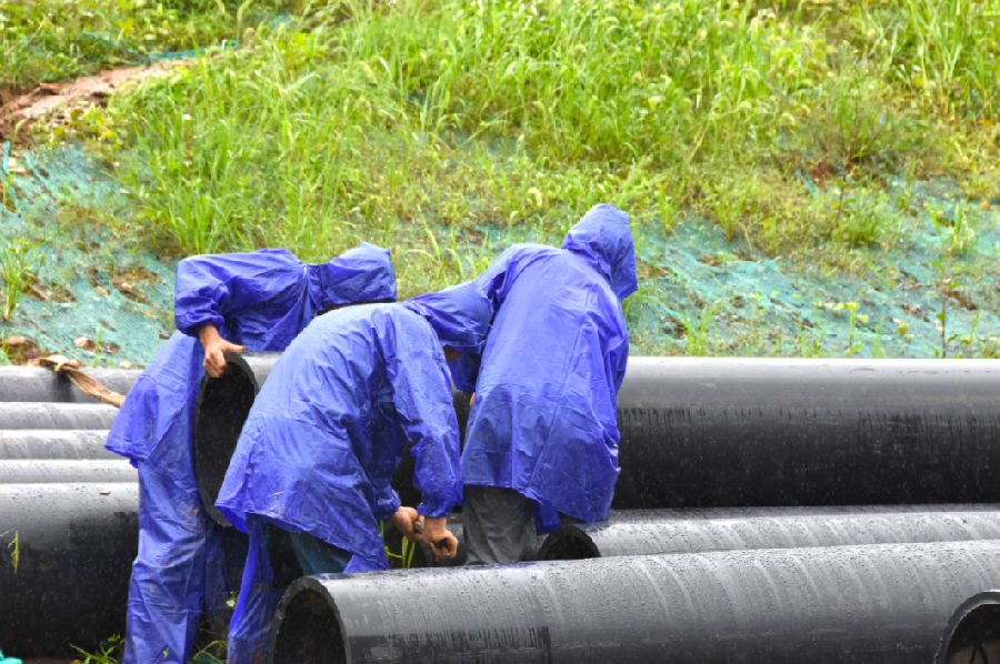連續(xù)一周的強(qiáng)降雨致使城區(qū)港道積水,市民出行受阻,武穴項(xiàng)目部安排5臺(tái)挖機(jī)、15名施工人員配合市防汛指揮部安裝臨時(shí)PE管,通過增壓泵將城區(qū)內(nèi)積水逐步排出。經(jīng)過兩天兩夜的堅(jiān)守,7月9日,橫貫城區(qū)、長江的排澇PE管安裝完畢,城區(qū)內(nèi)積水得以緩解。