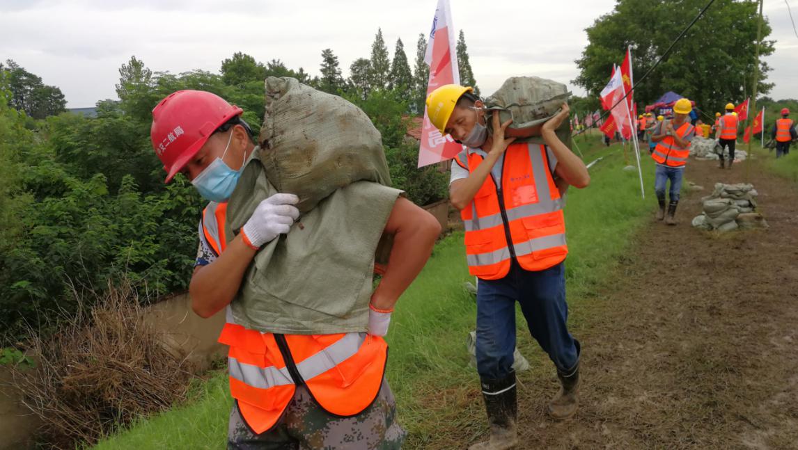 2號點的河堤旁邊,80名民兵隊員和168名防汛突擊隊員,分成24列從堤壩底端排列至堤上,接龍傳遞沙袋,以此碼至堤沿邊,鑄成一條白色的沙袋防護帶。一陣暴雨襲來,打在安全帽上轟隆直響,打得旗幟哐啷紛飛。“繼續發揚‘火眼’抗疫精神,全力以赴保衛朱家河!”在2號點,曾任“火眼”實驗室現場負責人劉宜全,此時成為了現場搶險總指揮,帶著200多名二航局職工俯下身子,奮力搶險。