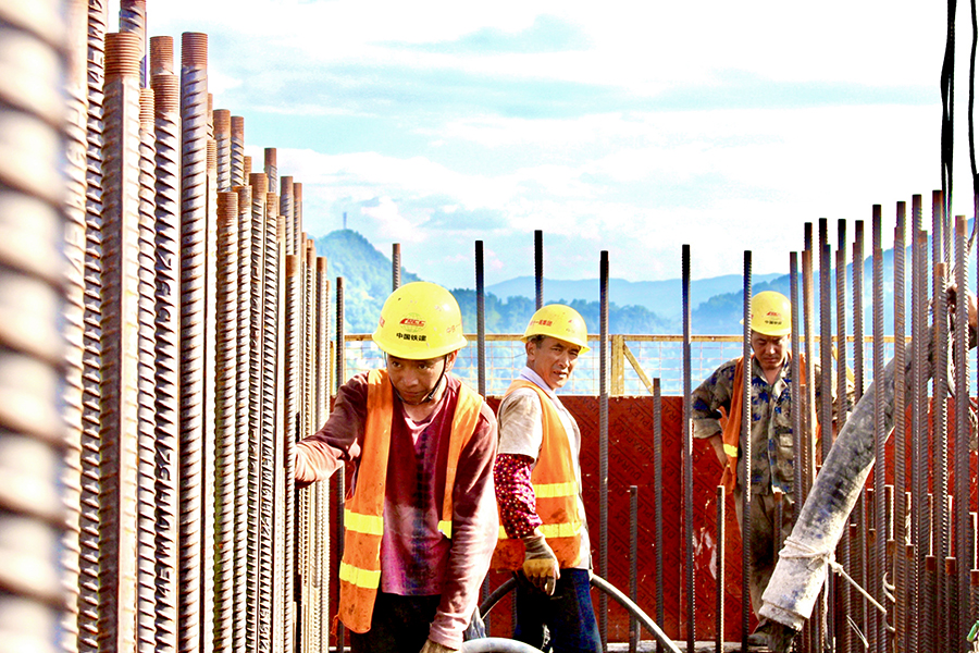 開展交心談心工作。入夏以來,該項目通過交流座談等形式,第一時間解決高溫下堅守崗位、辛勤工作的一線工人防暑降溫需求,聽取施工一線人員的建議。圖為烈日下的一線工人在百米墩身頂部焊接鋼筋。