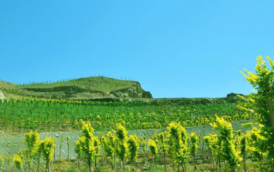 2018年5月10日,項目開工,惡劣的環(huán)境給人“迎頭一擊”。燕南山以沉積巖、砂礫為主,山體碎石裸露、千瘡百孔,土層薄、鹽堿重、蓄水能力差,有機質(zhì)平均不足3厘米,是植被生長的“生命禁區(qū)”,山上寸草不生。項目部決定給荒山“移植皮膚”——將山體裸露的巖石挖出,再填上0.6米至1米厚的種植土。項目在烏拉泊、五家渠等地購置種植土,平均每天400余輛大型土方車來回穿梭,歷時5個月,共“引進”56萬立方米種植土,整個山體“脫胎換骨”。隨后,項目部采取覆土、開溝、階梯、點穴、鋪設等措施,人工開挖5.2萬個樹坑,機械開挖16.9萬個樹坑、108公里溝槽和30公里梯田式平臺,建設5個蓄水池,鋪設70公里灌溉管線,為燕南山綠起來打下堅實基礎。