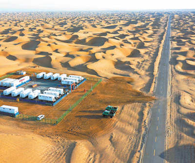中國石油塔里木油田塔中1號公路旁的2113隊沙漠營地。