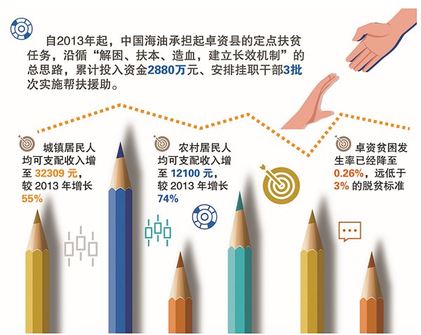 3月4日,經內蒙古自治區(qū)人民政府批準,中國海油對口幫扶地內蒙古卓資縣正式退出貧困縣序列。至此,中國海油對口幫扶的6個縣市全部脫貧摘帽。