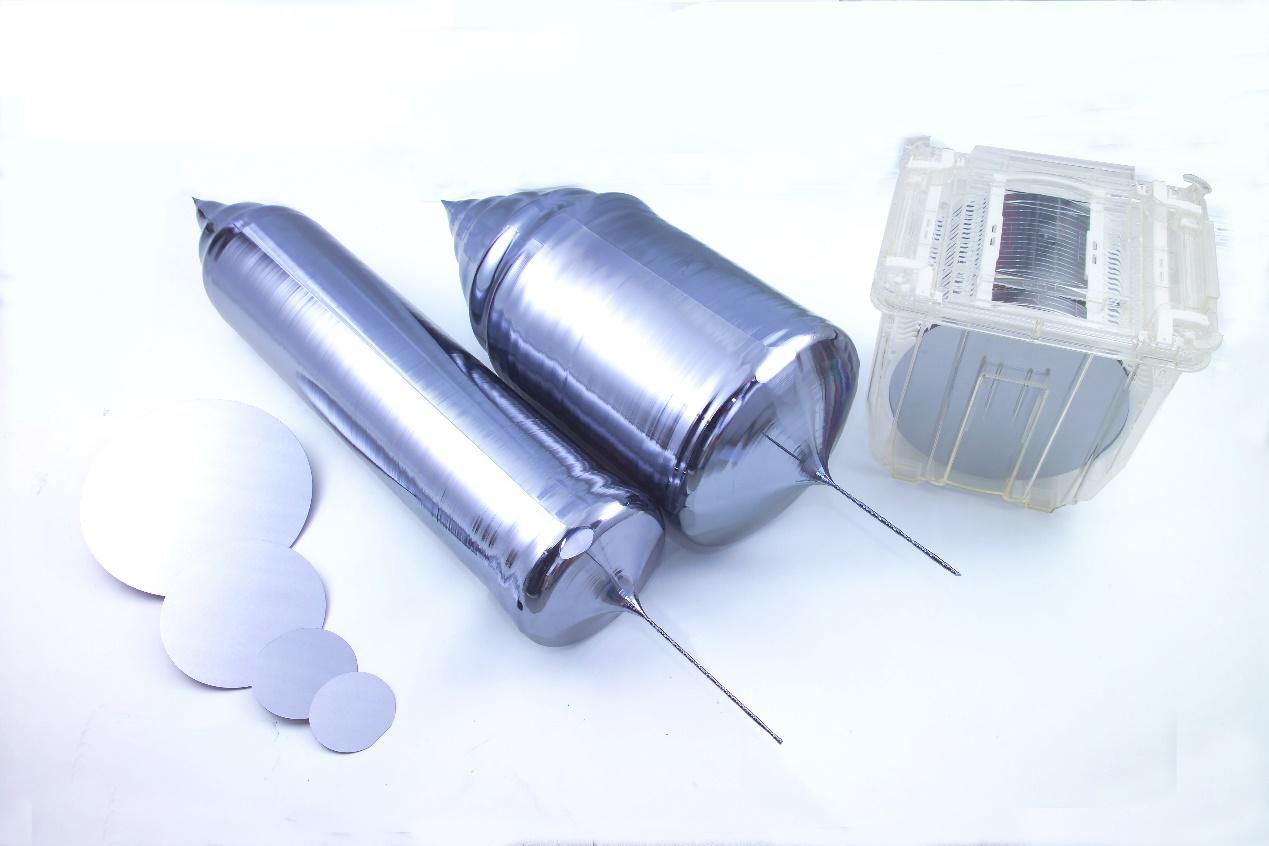 2012年3月12日,北京有色金屬研究總院建成中國第一條8"硅片生產(chǎn)線、12"硅片中試生產(chǎn)線。圖為單晶與硅片。(來源:有研集團(tuán))
