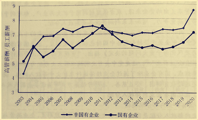 “國有企業內部高管-員工薪酬差距在絕大多數年度均低于非國有企業,這在企業內部收入分配公平上起了示范作用?!?月23日下午,中國社科院經濟研究所所長、國有經濟研究智庫主任黃群慧發布的《國有企業在構建新發展格局中的作用研究報告》(下稱“報告”)中稱。這一結論取樣于2003年-2020年。