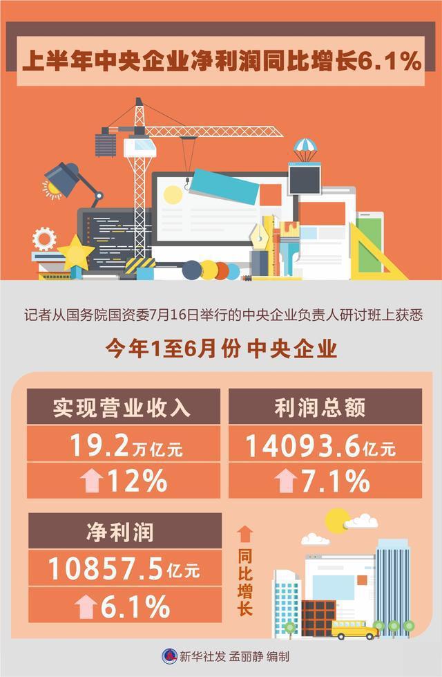 新華社北京7月16日電 記者從國務(wù)院國資委16日舉行的中央企業(yè)負(fù)責(zé)人研討班上獲悉,今年1至6月份,中央企業(yè)實(shí)現(xiàn)營業(yè)收入19.2萬億元、利潤總額14093.6億元、凈利潤10857.5億元,同比分別增長12%、7.1%、6.1%。