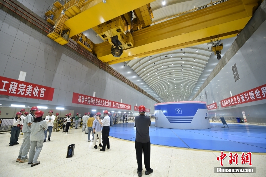 由于金沙江峽谷的特殊地形,白鶴灘水電站的廠房建在攔水壩兩側的山體中。白鶴灘水電站廠房也是世界最大的水電地下洞室群。圖為采訪團走進地下廠房,觀看發電機組。